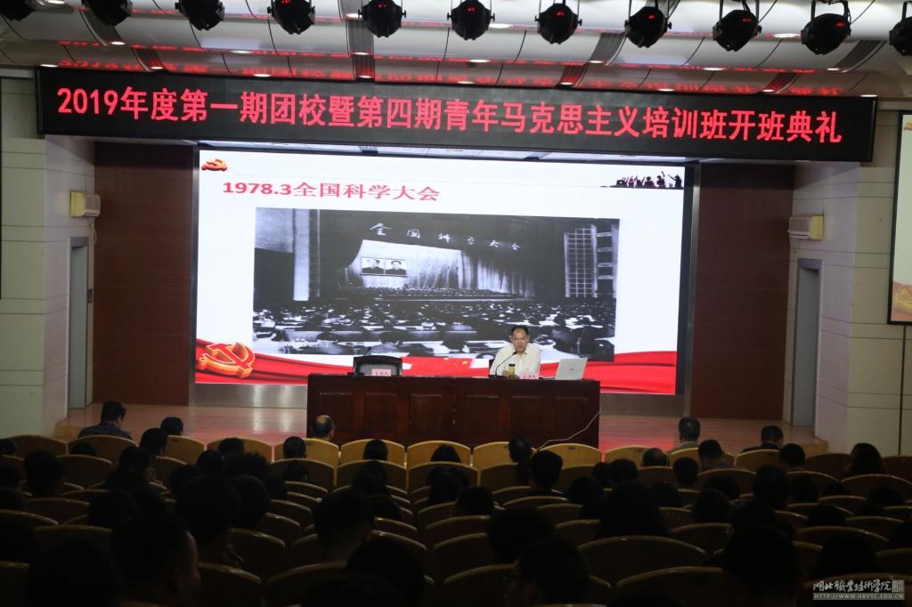 4月24日下午,校团委在学校文博馆学术报告厅举办了2019年度第一期团校暨第四期青年马克思主义者培养工程开班典礼,并邀请党委书记张国雄以“改变中国,影响世界”为主题为学员上了重要的第一课。副校长杨立明、党委组织部、宣传部、学工部主要负责人到会祝贺,各学院团总支书记、2018级团支书、校团委、学生会、社团主要干部300余人参加。会议由团委书记谭之平主持。