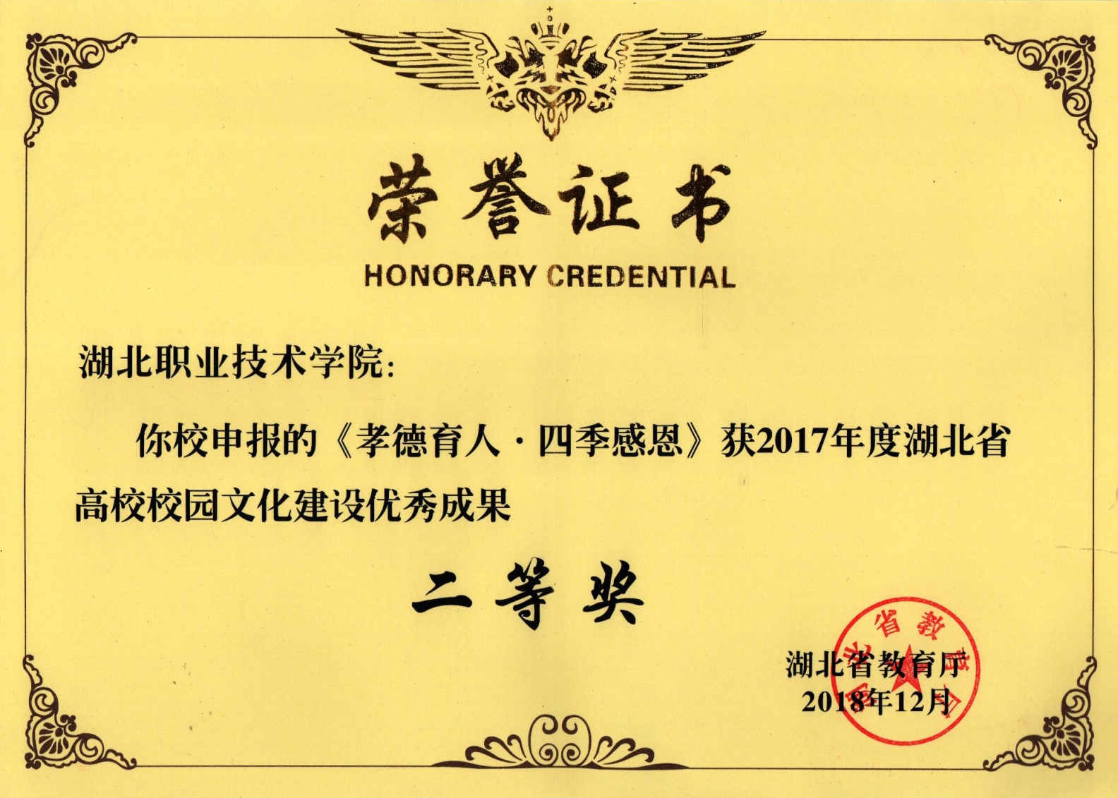 beat365官网选送的《孝德育人˙四季感恩——beat365英国官方网站创新校园文化工作机制案例》荣获湖北省2017年度高校校园文化建设优秀成果二等奖;党委宣传部吴春花、熊元焕、陈灏老师撰写的《扬零着意 润物成形——高职院校诗教育人实践探微》论文获纪念湖北省高等学校校园文化研究会成立30周年学术论坛征文二等奖。