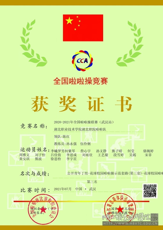 (本网通讯员:孙永强)2020-2021年全国啦啦操联赛(武汉站)日前圆满落下帷幕,beat365官网代表队以第一名的成绩荣获公开青年丁组花球规定动作(2020版)冠军,公开青年丁组-花球校园啦啦操示范套路第三名的优异成绩,学校体育部教师孙永强、伍伶俐作为指导教练荣获“优秀教练员”称号。