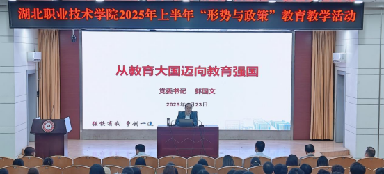 校党委书记郭国文以《从教育大国迈向教育强国》为题开展形势与政策的授课,从建设教育强国的重大意义、信心底气、总体要求等方面深入阐述,指出建设教育强国是全面建成现代化强国的战略先导,我国已建成世界最大规模教育体系,未来将持续坚持教育的政治、人民、战略属性,聚焦“六大”特质,构建“八大”体系,落实“五项”重点任务,建成教育强国助力中国式现代化建设。郭书记通过丰富案例,让同学们深刻认识到职业教育在教育强国建设中的关键作用。课程尾声,郭书记激励同学们锚定2035年建成教育强国的目标,跑好历史的接力棒,书写以教育强国建设支撑引领中国式现代化的时代新篇。