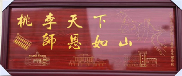 “桃李天下,师恩如山”是母校育人硕果的生动写照,诉说着学子们对老师的崇高敬仰。匾额之上,算盘凝聚财经专业特色,长城彰显旅游风华;文博馆曾映照学子们求知的眼眸,翠湖畔的亭子珍藏着青春的欢愉,教学楼承载着知识的殿堂。匾额祝福着母校巍峨永固,桃李岁岁芬芳;祝福恩师安康,广育天下栋梁。