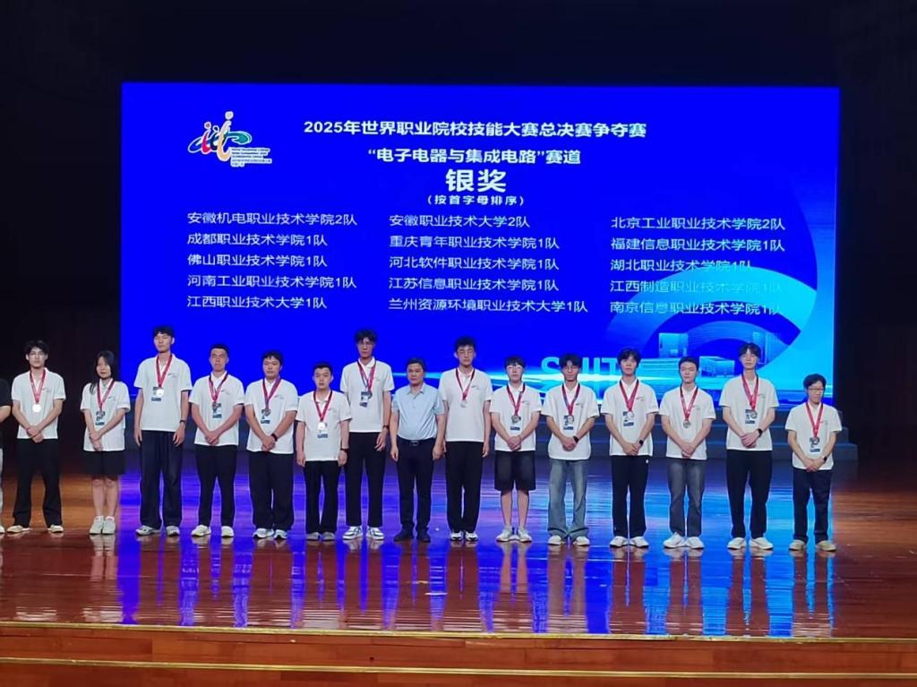 (本网讯 周伟 桂宏凡)8月27日至31日,2025年世界职业院校技能大赛总决赛争夺赛“电子电器与集成电路”赛道(高职组)在深圳信息职业技术大学举行。本次大赛吸引了全国153支参赛队伍、600余名选手同台竞技。经过激烈角逐,由beat365官网机电工程学院周伟、桂宏凡两位老师指导,熊铭硕、周羽、黄焰霞、乐经城等4名学生组成的代表队,凭借扎实的专业功底和出色的临场表现,成功斩获银奖。