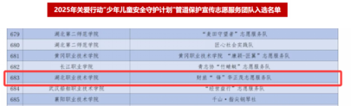 (本网讯 蔡思政)近日,团中央青年志愿者行动指导中心等单位联合公布了2025年关爱行动“少年儿童安全守护计划”管道保护宣传志愿服务团队入选名单,湖北职院财经与旅游学院“锋”华正茂志愿服务队凭借扎实的志愿服务基础与精心设计的项目方案,从众多团队中脱颖而出,成功入围。