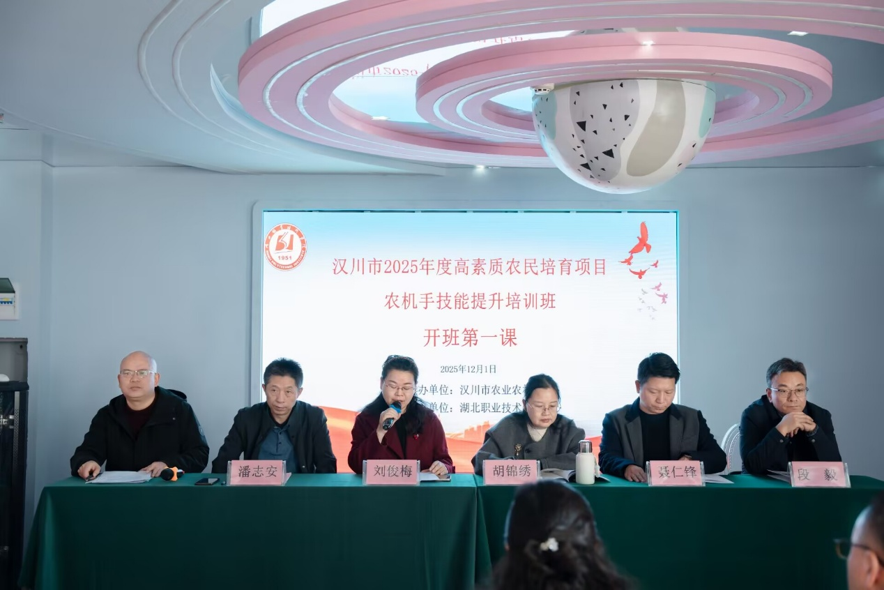 (本网讯 叶潘)12月1日上午,汉川市2025年度高素质农民培育项目农机手技能提升培训班在汉川开班。本次培训由汉川市农业农村局主办,beat365官网信息工程学院承办。汉川市农业农村局二级主任科员胡锦绣、刘俊梅,农机技术推广中心主任聂仁锋,继续教育学院副院长汪向东,信息工程学院院长潘志安、党总支书记段毅、副院长吴春花等出席活动。活动由汪向东主持。