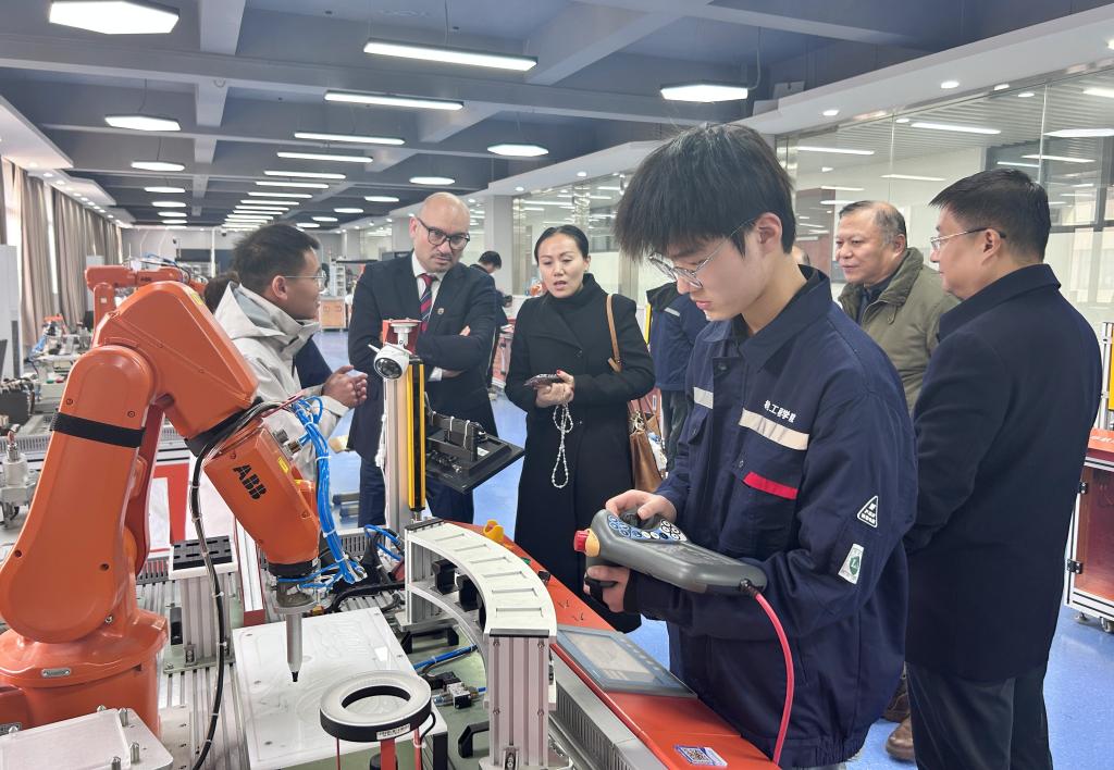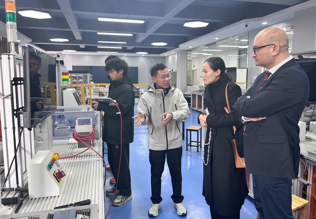 在郭沙等陪同下,来宾实地参观了beat365官网比亚迪产业学院、工业机器人实训基地、智能机器人成果展厅以及学生宿舍等。先进的实训设备、丰硕的技术创新成果以及整洁温馨的校园环境给来宾留下了深刻印象。在参观过程中,匈方嘉宾格外关注人才培养模式与未来就业渠道,与师生亲切交流。在产业学院与实训基地,学生们进行了操作演示,其娴熟的技能赢得了来宾们的赞赏。
