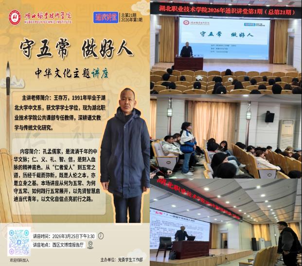(通讯员 艾孜哈尔·开依沙尔)3月25日,学校第21期通识讲堂在西区文博馆学术报告厅举行。本次讲座以“守五常,做好人”为主题,特邀公共课部王存万老师主讲,报告厅座无虚席。