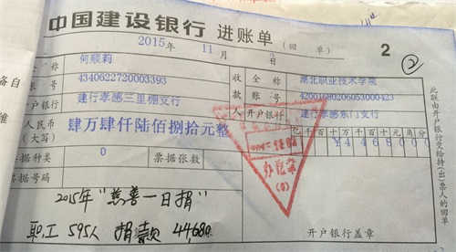2015年10月16日,学校工会根据市政府“慈善一日捐”通知精神,以“伸援手,救急难”为主题,以“慈心为民、善举济世、以人为本、为民解困”为宗旨,组织全体工会会员献爱心,共收到教职工595人捐款44680元。另收到农工党湖北职院支部14人捐款1200元。总计捐款人数为609人,捐款金额45880元。根据财经纪律,工会将所有捐款存入学校账户监管。上述捐款上缴10000元孝感市慈善总会,余下捐款学校将分步骤、分阶段用于精准扶贫点。