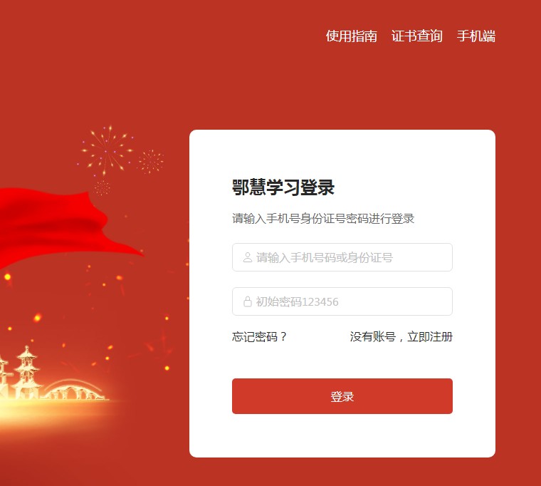 鄂慧学习—湖北省专业技术人员继续教育学习网在线学习平台网址:www.hubei21.com。学员进入继续教育网首页后,用户名为个人身份证号码,登录密码为:123456,进行登录学习。
