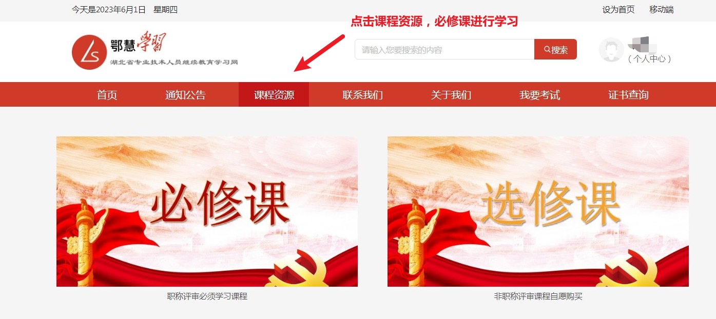 1.学员登录后就进入在线学习平台,点击“课程资源”中的“必修课”。