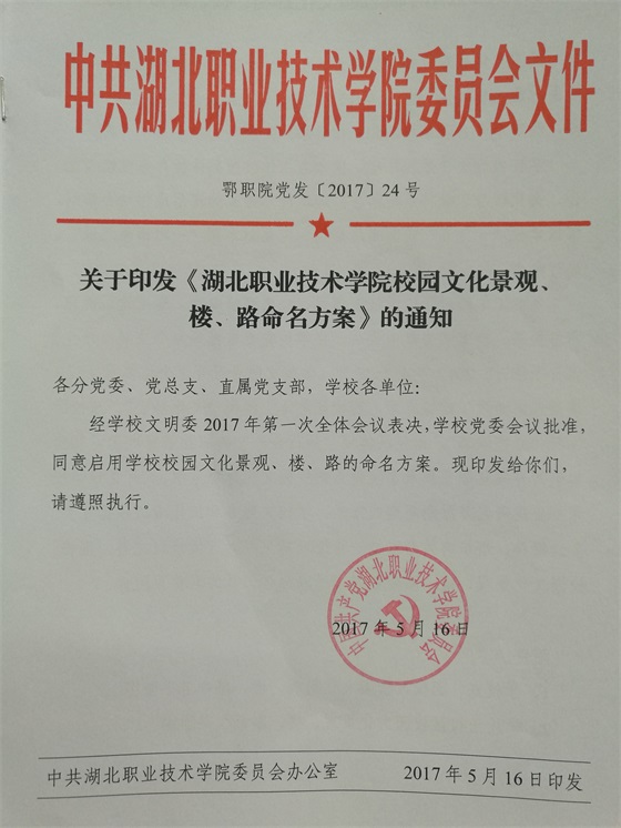 命名工作经过了广泛征集意见、分类调研座谈、专家论证优化、网络投票、校文明委集中表决、报学校党委审批等六个主要工作步骤有序推进。2017年4月27日,学校文明委召开了全体委员会议,投票表决通过了建议方案。西校区总体上体现“文化昌盛”,东校区体现“德技双馨”,南校区体现“知行合一”的职业教育理念,初步构筑具有beat365英国官方网站特点的校园文化标识系统。5月2日学校党委会议研究并原则同意此方案。学校文明办和工作专班根据党委会议精神,组织有关专家进一步征求意见并对方案修订完善,现将校园文化景观、楼、路命名方案予以公告。具体名称见附件。