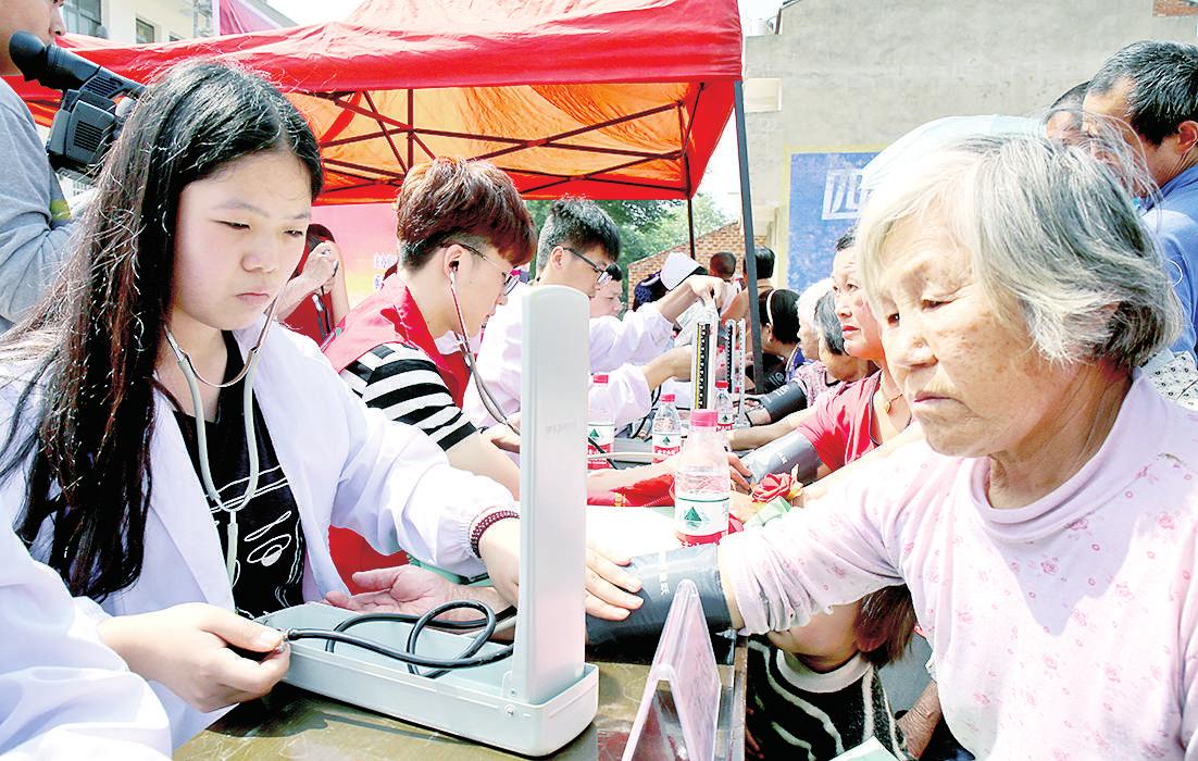 5月25日,beat365英国官方网站的专家教授和医护人员为汉川市回龙镇新桥村村民免费体检。当日,该院在精准扶贫点新桥村开展“科普周·社科专家乡镇行”活动,在义诊的同时,还开展了科普活动。(记者 匡文杰 摄)