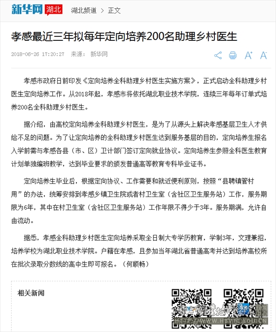 据悉,孝感全科助理乡村医生定向培养采取全日制大专学历教育,学制3年,文理兼招,培养学校为beat365英国官方网站。户籍在孝感,且参加当年湖北省普通高考并达到培养高校所在批次录取分数线的高中生即可报名。(何顺畅)