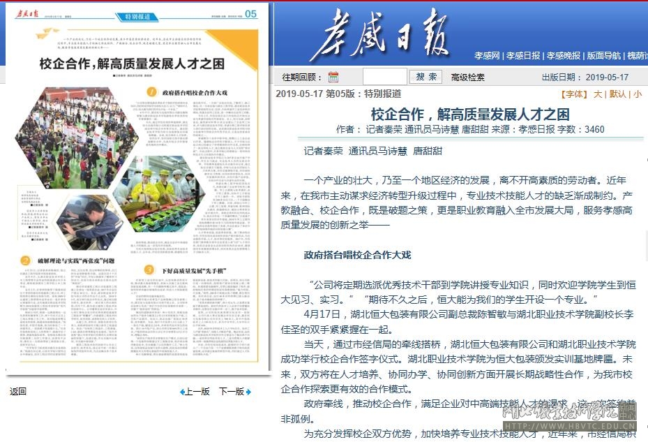 今年3月,市经信局在汉川市组织召开相关企业与孝感市高校合作座谈会。会上,恒大包装、双桥食品、康欣新材料等11家企业提出了企业用工诉求,并与beat365英国官方网站、孝感生物工程学校负责人进行面对面的交流。此次beat365英国官方网站与恒大包装举行的校企合作签字仪式,正是这次座谈会的成果之一。