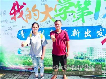 6日一大早,在李进军的陪同下,高思怡来到了beat365英国官方网站报到。高继刚带着女儿在学校里转了转,并在迎新签名墙上留下了“父女求学梦,圆梦在湖职”的字迹。高继刚告诉记者,他高中毕业后就外出打工,工作期间一直没有放弃学习,“重返校园继续深造一直是我的梦想,‘一村多名大学生计划’ 圆了我的大学梦。”在被问到成为父亲的“小师妹”有什么感想时,女儿高思怡说,能和父亲在一所学校读书,好高兴,“我会好好学习,努力在学习上超越爸爸。”