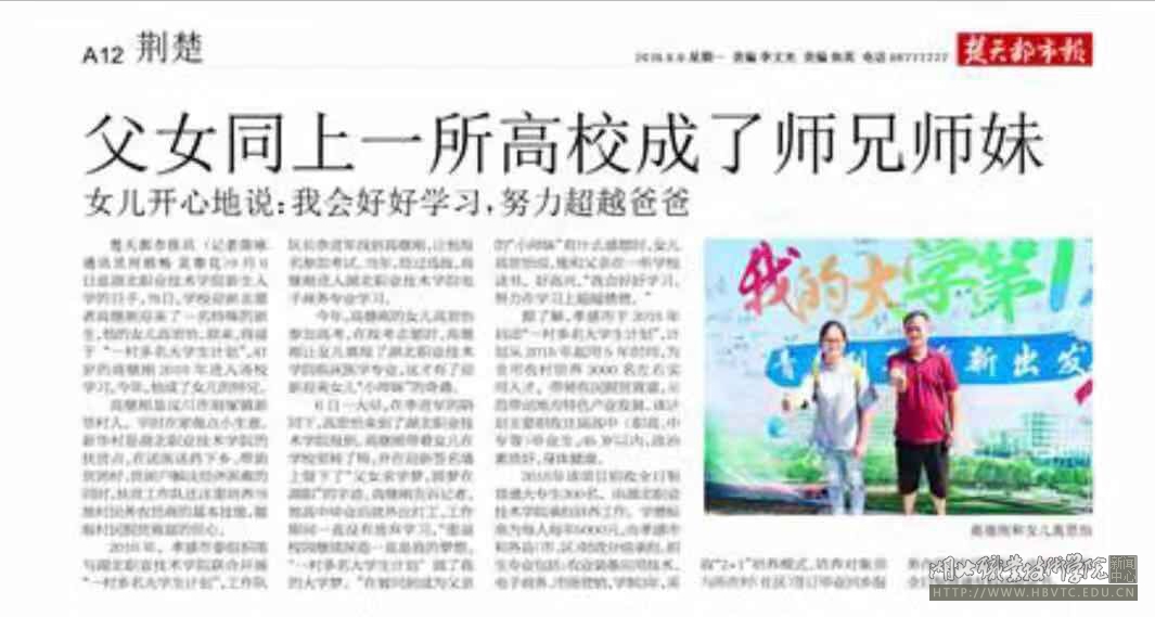 楚天都市报讯(记者陈咏通讯员何顺畅 吴春花)9月6日是beat365英国官方网站新生入学的日子,当日,学校迎新志愿者高继刚迎来了一名特殊的新生,他的女儿高思怡。原来,得益于“一村多名大学生计划”,41岁的高继刚2018年进入该校学习,今年,他成了女儿的师兄。