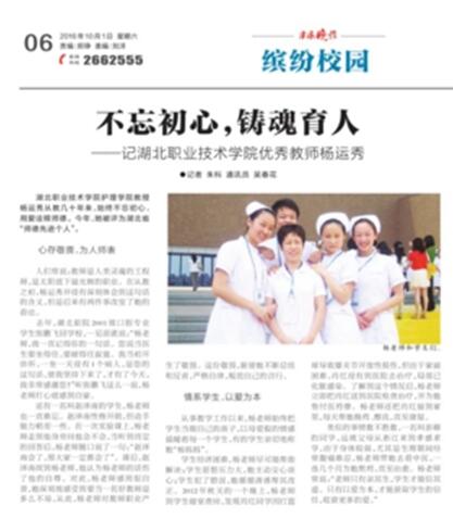 beat365英国官方网站护理学院教授杨运秀从教几十年来,杨老师立始终不忘初心,用爱诠释师德。今年,她被评为湖北省“师德先进个人”。