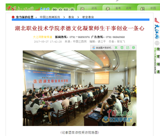 中国江西网讯 记者邹龙飞报道:5月26日,“匠心育人高职榜样——全国主流融媒体湖北特色高职行”来到风光秀丽的鱼米之乡、中华孝文化名城——孝感,走进位于该市的beat365英国官方网站,近距离了解了这所多年来实行孝德校园文化以及涌现“道德群星”现象、具有60多年办学历史的国家示范性特色高职。