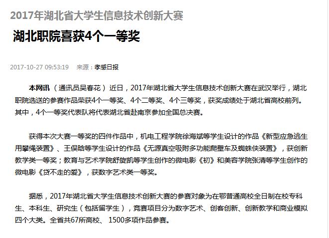 【孝感日报】2017年湖北省大学生信息技术创新大赛 湖北职院喜获4个一等奖