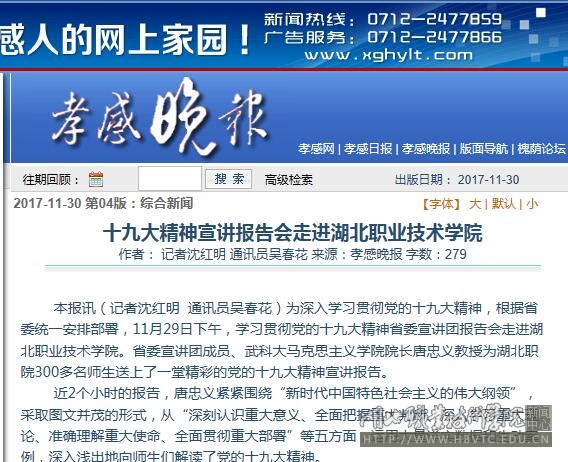 本报讯(记者沈红明 通讯员吴春花)为深入学习贯彻党的十九大精神,根据省委统一安排部署,11月29日下午,学习贯彻党的十九大精神省委宣讲团报告会走进beat365英国官方网站。省委宣讲团成员、武科大马克思主义学院院长唐忠义教授为湖北职院300多名师生送上了一堂精彩的党的十九大精神宣讲报告。