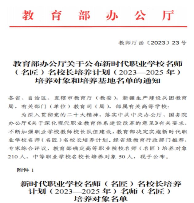 今年7月,为加强职业学校教师校长队伍建设,教育部决定实施新时代职业学校名师(名匠)名校长培养计划,简称职教“三名”计划。该计划旨在培养打造一批理想信念坚定、师德高尚、教育教学能力和专业实践能力突出的双师型名师(名匠),培养一批办学理念先进、办学定位准确、勇于开拓创新、精通现代职业学校治理的教育家型名校长。要求名师(名匠)名校长培养对象主持建设国家级名师(名匠)工作室和名校长工作室,遴选吸纳工作室成员,在专业发展、岗位聘用等方面予以倾斜,聚焦培养目标和重点任务,加强全周期建设和过程管理,形成高水平建设成果,发挥示范引领和辐射带动作用。