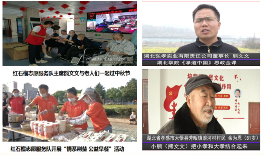 熊文文,湖北职院财经与旅游学院2023届毕业生,大悟县芳畈镇徐楼村人。他以强烈的使命感汲取文化之泉,赓续红色血脉,向上向善而行,十七年如一日,照顾遭遇车祸的父亲,休学两年共用六年时间取得全日制大学本科文凭,用三年时间在湖北职院学习技能,把工厂建在村里,推进农产品深加工,带动一二三产业融合发展,形成产业链,吸收乡亲们在家门口就业,在工厂区创办徐楼村“幸福食堂”,解决高龄老人吃饭难问题,常年为大悟县其它“幸福食堂”捐赠生活物资,让老人们乐享幸福滋味。2020年9月,当选第十一届孝感市“十大孝子”;2020年11月,当选第六届孝感市“道德模范”;2022年9月,当选中国大学生自强之星;2024年3月,获评孝感五一劳动奖章;2023年7月,获评“中国网事·感动人物”。
