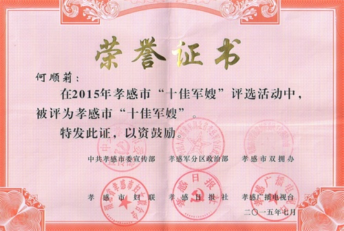 2015年“十佳军嫂”评选活动,由孝感市委宣传部、孝感军分区政治部、孝感市双拥办、孝感市妇联、孝感日报社、孝感广播电视台联合举办,评选活动得到全市各单位的高度重视,积极推荐优秀候选人,经过逐层选拔,最终评选出“十佳军嫂”10名、“十佳军嫂”提名奖10名。本次评选活动的成功举办,为纪念中国人民抗日战争暨世界反法西斯战争胜利70周年、创建双拥模范城等营造了浓厚氛围,同时大力宣传了我市军嫂在经济建设、社会建设、国防建设中的突出贡献,不断增强了广大军民的国防意识和爱国热情。