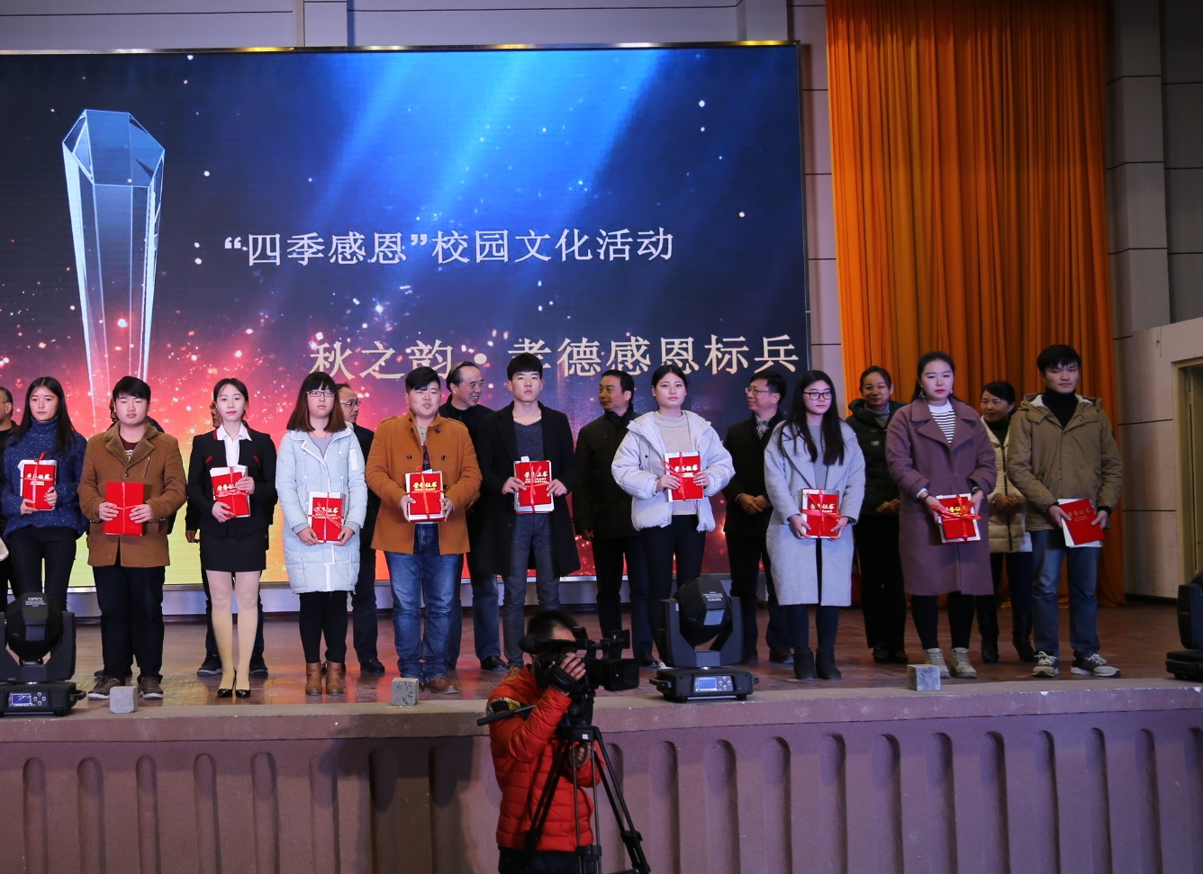会上,出席领导和嘉宾为“四季感恩”校园文化活动受表彰的先进集体和先进个人颁奖。2016年,学校制定并实施了“四季感恩”校园文化品牌建设方略。一是开展了“春之歌•魅力湖职”校园文化艺术节系列活动,活动项目包括“两创”口号征集、诗歌、散文、微小说、摄影、微电影、金话筒等12个类别。收集作品4000多件,参与人数达2000人次,评选表彰近200人次。在精彩纷呈的校园文化艺术节系列活动中,学校师生积极响应和热情参与,报送的作品形式多样,内容丰富,且具有一定的思想性和艺术性;二是开展了“夏之行•大孝湖职”社会调研与社会实践活动,师生在暑假期间,纷纷结合专业特色及当地实际情况,开展“六个一”社会服务、社会实践和社会调研活动,如附属医院开展“为抗洪英雄义诊”活动,建筑技术学院刘帅同学结合学校招生情况开展调研等,既提升了专业技能,也服务了区域经济社会发展,产生10个优秀典型案例。三是开展了“秋之韵•感恩湖职”孝德典型评选表彰活动,活动评选表彰了27名孝德感恩标兵,24个孝德感恩先进集体,227名感恩先进个人。他们或孝敬父母,尊老爱幼,或勤奋刻苦,自立自强,或心系祖国,胸怀大志,或继承和发扬中华民族的传统美德,将孝德感恩教育和实践体现在生活的点点滴滴中。他们的典型事迹在师生中产生了良好的反响,营造了向上向善校园文化氛围。