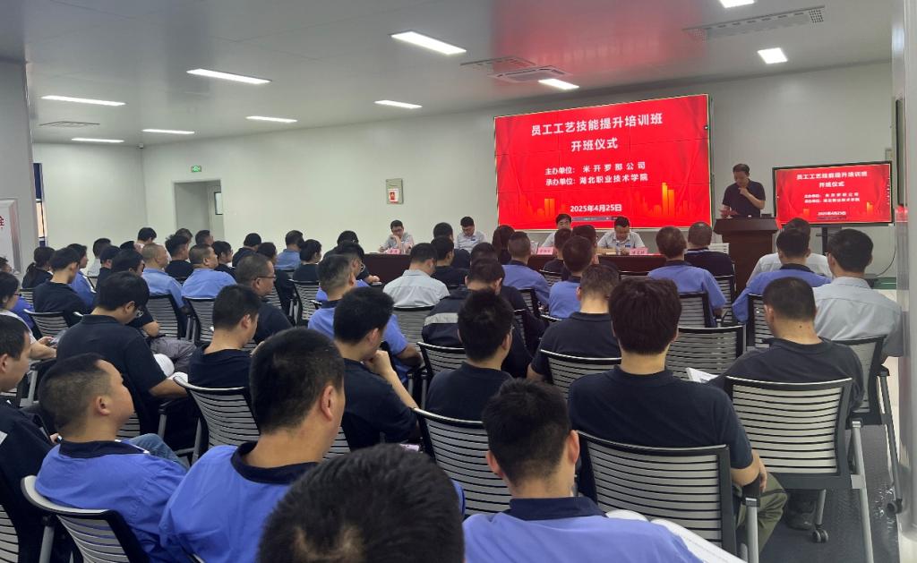 (本网讯 曹艺)4月25日,由米开罗那公司主办,beat365官网承办的“员工工艺岗位技能提升培训班”开班仪式成功举行。米开罗那技术管理部部长李银生,制造部副部长何明康、陈星祥,beat365官网机电工程学院负责同志出席开班仪式,米开罗那公司150名职工参加开班仪式。