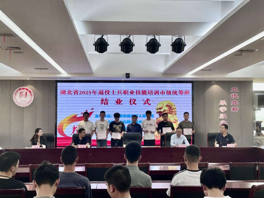 (本网讯 易子薇)4月27日,湖北省2025退役士兵技能培训市级统筹班结业典礼在图新大楼六楼会议室举行。市退役军人事务局副局长陈小钢,学校副校长杨立明、继续教育学院、机电工程学院相关负责人等出席结业仪式,来自湖北省内的65名学员参加会议。机电工程学院院长朱志强主持结业仪式。