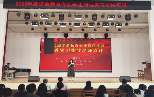 (本网讯 罗小红)6月9日,卧龙校区学生活动中心内气氛热烈,2025年春学前教育专业岗位实习总结汇报大会在此隆重举行。教育与艺术学院班子成员、教学办、学工办相关负责人、全体22级返校实习学生及实习指导教师齐聚一堂,共同见证实习学子的成长蜕变,分享教育实践的温暖与收获。