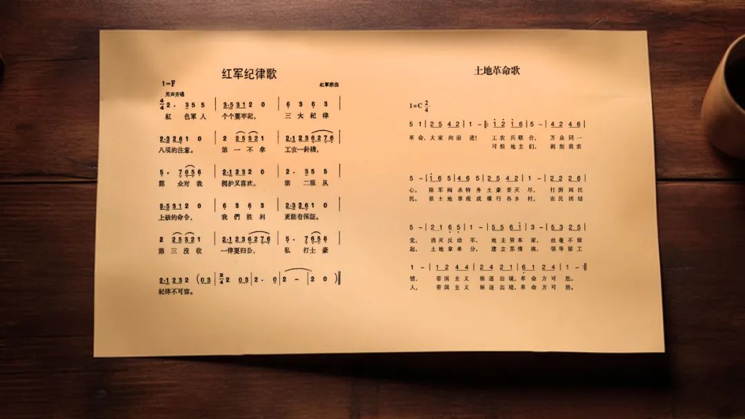 1932年11月,鄂豫皖省委在七里坪檀树岗重新组建了红二十五军,担负保卫根据地的重任。政治纪律教育期间,红十五军团负责新兵和解放战士教育工作的时任秘书长程坦找到时任宣传科科长刘华清,建议将“三大纪律八项注意”编为歌曲,便于部队传唱牢记。随后,程坦和刘华清借用了鄂豫皖苏区流行的《土地革命完成了》的歌谱配合歌词。就这样,歌词形象、曲调简单的《三大纪律八项注意歌》在部队唱响。后来,这首歌又伴随红二十五军走出红安,一直唱到了延安。