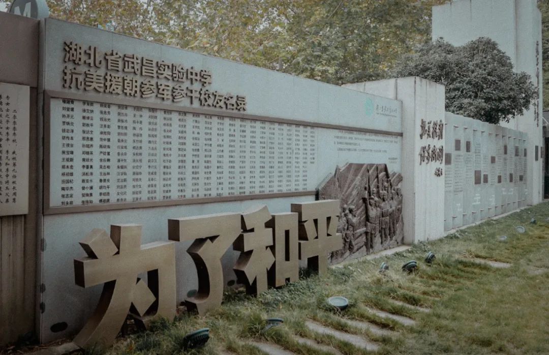走进湖北省武昌实验中学,一面纪念墙映入眼帘,灰色的大理石墙上,密密麻麻地刻着309名学生的名字,下面写着“为了和平”4个大字,旁边有面以在抗美援朝战场上“空中拼刺刀”的陶伟等校友为原型制作的浮雕。