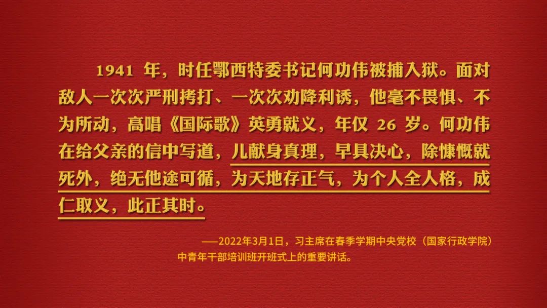2022年3月1日,中央党校(国家行政学院)中青年干部培训班在中央党校开班,习近平总书记在开班式上发表的重要讲话中诵读了时任鄂西特委书记何功伟的“绝笔家书”:“儿献身真理,早具决心,除慷慨就死外,绝无他途可循,为天地存正气,为个人全人格,成仁取义,此正其时。”