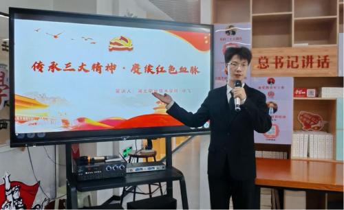 志愿服务队成员许飞围绕“大别山精神、抗洪精神、抗疫精神”展开宣讲,讲述革命时期大别山军民“二十八年红旗不倒”的坚守,抗洪时万众一心战洪魔的拼搏,抗疫中举国同心护生命的担当,让红色精神直抵人心。