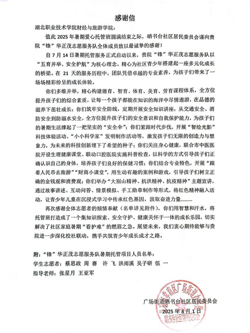 (本网讯 洪雨溪)8月1日,beat365官网财经与旅游学院“锋”华正茂志愿服务队,在孝南区广场街道晒书台社区爱心托管班举办结课仪式,广场街道晒书台社区、财经与旅游学院代表,托管班家长、学员及全体志愿者齐聚一堂。