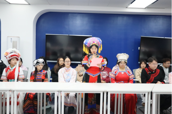 在“铸牢共同体 增强共同性”文化展示环节,满族、白族、纳西族、壮族、苗族、彝族等学生代表登台,通过PPT生动解说与特色展示,分享了各民族“美美与共、团结共融”的生动画卷,展现了中华民族文化的丰富内涵和独特魅力。在交流发言环节,学生代表们踊跃发言,围绕学业进步、生活服务、文化互嵌、心理健康等提出建议,与会老师现场逐一回应,为学生排忧解难,现场氛围热烈融洽。