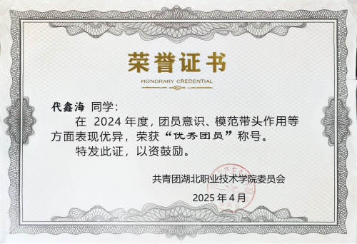 孝感是文化名城,也是英雄之城,孝铸共同体,中华一家亲。代鑫海自踏入湖北职院美丽校园起,便将坚定理想信念摆在首位,郑重递交入党申请书。他认真学习党的创新理论,积极参加石榴红•孝廉谷活动,铸牢中华民族共同体意识,甘于奉献,表现出色,荣获校2024年度“优秀团员”称号。思想上的积极进取,为他各方面的成长奠定了坚实的基石。
