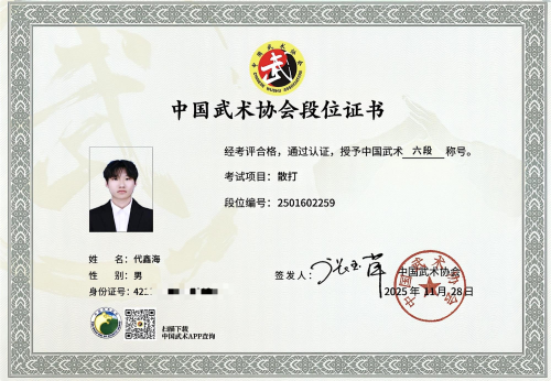 代鑫海是校散打队的核心队员。在杨雷等教练团队的精心指导下,他与队友们刻苦训练,作风顽强。在2025年中国大学生武术散打锦标赛上,他凭借顽强的意志、精湛的技术和稳定的心态,勇夺个人亚军和团体亚军,闪耀全国赛台。2025年11月,他的武术造诣再获权威认可,被中国武术协会授予散打项目六段称号。从县级田径赛场的奔跑,到全国散打赛台的搏击,他不断挑战自我,展现了卓越的体育素养和拼搏精神。