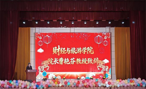 财经与旅游学院院长曹艳芬致辞。她从品牌打造、技能竞赛、科研服务、产教融合等方面深情回顾了学院过去一年的办学成果,并对新的一年做出美好展望,激励全体师生继续凝心聚力、笃行实干,共同绘就学院高质量发展的崭新篇章。