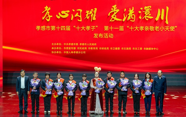 活动现场庄重而温馨。云梦县城关镇曙光社区居民龚钟山、孝昌县小悟乡项庙村村委会委员董佩杰、湖北职院2023级学生阿依舒阿克·金格斯、孝感市妇幼保健院儿科副主任刘志敏、高新区三江物业公司退休职工许亚娟、汉川市汈东街道办事处中心小学教师董又奇、安陆市经开区新河社区居民王国金、应城市黄滩镇胜利村村委会委员王翠、孝南区郝庙新村刘鲁湾居民周翠华、孝感市儿童福利院社工师王连华当选孝感市第十四届“十大孝子”。