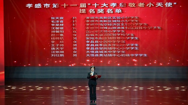 双峰山旅游度假区双峰中学学生沈浩泽、湖北航天高级中学学生余雅雯、汉川市第一高级中学学生李唐文、孝感市孝南区车站中学学生方子轩、孝南区黄香路小学学生严卓熙、安陆市接官乡初级中学学生张妙涵、云梦县吴铺镇中心小学学生聂睿晗、云梦县曾店中心小学学生曾雨涵、云梦县胡金店镇初级中学学生刘一帆、应城市实验初级中学学生冯隽楠荣获孝感市第十一届“十大孝亲敬老小天使”称号。