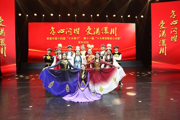 市文化中心孝感大剧院座无虚席,真情满满。《美丽中国》是“孝心闪耀・爱满澴川”孝感市第十四届“十大孝子”、第十一届“十大孝亲敬老小天使”发布活动的压轴文艺节目,荆楚石榴红艺术团12位学子身着民族特色服饰激情起舞,将“孝亲敬老”的主题与“孝铸共同体 中华一家亲”的理念完美融为一体,赢得全场经久不息的掌声。观众在活动结束后,与荆楚石榴红艺术团的同学交流,称赞《美丽中国》让大家眼前一亮,演出有“大学味”“民族风”“中华情”。