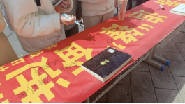 中午时分,教学楼前印有“怀‘志’前行燃青春、追‘锋’奋进新征程”的红色横幅格外醒目,吸引了过往师生的目光,在学生志愿者的引导下,大家有序排队,满怀热情地参与到签字活动中。活动开始,老师们率先在横幅上郑重签名,表达对学雷锋活动的支持与倡导。随后路过的同学们也纷纷上前,签下了自己的名字,承诺将雷锋精神融入日常学习生活中,营造积极奋进、和谐互助的校园氛围。活动现场,许多同学在签名后还相互交流着对雷锋精神的理解和参与志愿服务的计划。